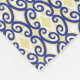 Fleece blanket with a pattern in navy, yellow and white. Diamond shapes and swirly decorative elements.