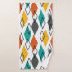 This towel set has a mid-century modern design of diamonds in orange, yellow, turquoise, grey, and outlined scattered throughout on a field of white.