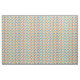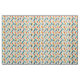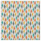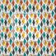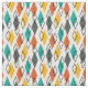 This fabric has a mid-century modern design of diamonds in orange, yellow, turquoise, grey, and outlined scattered throughout on a field of white.
