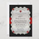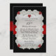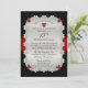 Brilliantly sophisticated and stylish 15th wedding anniversary invitation with black background and ruby red faux printed satin ribbon with diamonds and ruby printed hearts arranged in a rounded rectangular frame. The faux red satin ribbon and black background are continued on back for a polished, sophisticated look. Original design by Holiday Hearts Designs (all rights reserved). Please note that all embellishments are printed.