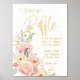 Rustic and elegant rustic baby shower diaper raffle sign featuring a cascading floral bouquet of soft pastel watercolor roses, peonies and foliage in shades of blush pink, pale peach and ivory cream, with soft green botanical leaves and eucalyptus greenery and a hint of gold flecked leaves, accented with handwritten style calligraphy. Use our easy to customize template to personalize with your baby shower details - the back is a rich muted green with a beautiful bouquet of matching flowers . ©WhimsicalArtwork™