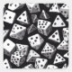 This dynamic digital artwork features an array of tumbling dice against a stark black background. The dice vary in shape and size, including traditional six-sided cubes and triangular four-sided forms. Each die is meticulously detailed, with sharp contrasts between the white surfaces and black pips, creating a striking visual effect. The chaotic yet harmonious arrangement of the dice evokes a sense of motion and randomness, making the piece both intriguing and playful.