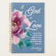 Planificateur chrétien personnalisé avec versets bibliques. Conçu avec le verset "Dieu est amour" de 1 Jean placé contre un arrière - plan bleu profond avec une délicate fleur d'aquarelle rose.