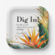 Introducing the Birds of Paradise Bliss Round Paper Plate, featuring a captivating dark green backdrop adorned with a delightful frame showcasing the exotic beauty of birds of paradise from the Birds of Paradise Bliss collection. This particular plate carries a touch of humour with the caption: "Dig in! For the record, calories don't count at weddings!" Below the caption, couples' names are playfully presented, accompanied by the date of the ceremony. This lighthearted and visually stunning design adds a unique and entertaining touch to the paper plate, making it not only a functional element but also a charming and amusing accessory that brings joy to the Birds of Paradise Bliss collection.