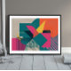 This artwork fuses a nostalgic digital aesthetic with crisp modern minimalism. Hot pinks, deep teals, mustard yellow, and punchy oranges form intersecting planes over textured grey surfaces, simulating wood grain or analogue scan lines. Grids, stripes, and partial halftone patterns contribute to a sense of retro-tech disruption—as if this were a signal glitch turned into visual poetry.