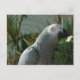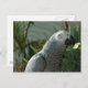 Pretty Congo African Grey parrot against a Palm Tree background with the sun giving her a glint in her eye.