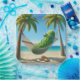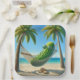 Big green dill pickle hanging between two tropical palm trees on a beach with flip-flops.