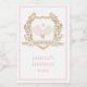 This wine label has a watercolor image of a crest surrounded by floral branches with green and pink gingham pickleball paddles in the centre. Text says "Dinks and Drinks." Colours used include moss green, blush pink and and tan.