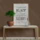 Elegant vintage Victorian style poster for kitchen, bar, cafe or restaurant. The words read "Eat Drink and Be Merry!" The white background colour is customizable.