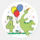 Fourth Birthday cute green brontosaurus dinosaur with party hat and balloons, volcano in the background, with text that reads "I'm 64 in green.