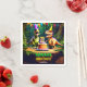 Dino four colourful dinosaur birthday party tableware personalized template napkins, dinosaurs wearing party hats with a birthday cake dinosaur birthday napkins