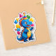 Ek cute cartoon dinosaur party hat pehne hue, balloons ke beech khada hai, background mein cupcakes aur confetti.