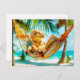 Lazy dinosaur relaxing in a hammock between palm trees. A calm and funny prehistoric beach moment.