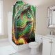 This shower curtain has a dinosaur pictured on it.