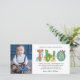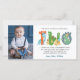 Modern, simple and elegant boy second birthday thank you card. Design featuring Dino script two , thank you message and a photo. Perfect as a thank you for Dinosaur themed second birthday party.