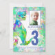 T-rex dinosaur 3rd birthday party invitation with photo template to celebrate your little T-Rex turning three with the perfect birthday party for the boy who loves prehistoric dinosaurs. This Roaring Tyrannosaurus Rex invites Dino fans to a fun 3rd birthday party. Personalize this colourful watercolor splash blue and green third birthday invitation with a photo of the birthday boy or girl, the number of the birthday and the party details and you are all set for a fun packed dinosaur themed dino birthday. All dinosaur species are welcome. Unique original artwork by artist Catherine Sweetman