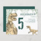 Roaring T-Rex and velociraptor dinosaur fifth birthday party invitation with jungle foliage and green modern typography. Dino fans especially boys will love this brown and green prehistoric themed 5th birthday party invite. Easy to personalize with the name of the birthday boy or girl, the number of the birthday and the party details. You are all set for a fun packed dinosaur jungle themed dino birthday. All dinosaur species are welcome. Prehistoric jurassic era Dinosaur illustrations, original artwork by artist by Catherine Sweetman
