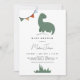 Dinosaur baby shower invitation in a minimalist style with a cute green dinosaur and pattern on back. You can personalize this invitation with your own details under the "Personalize this template" section.