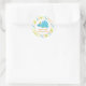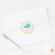 This cute dinosaur sticker has an orange, green, and blue stripes background. In the middle, there's a circle with a blue dinosaur with a party hat on his head. Below the dino, you can easily personalize the text!