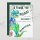 A unique way of saying thank you with a T-rex dinosaur roar for making a birthday party roarsome. Fun dinosaur birthday party thank you card easy to personalize with modern green typography templates. Colourful Tyrannosaurus rex and prehistoric Jurassic jungle foliage. Original dino artwork and greenery watercolor by artist Catherine Sweetman
