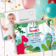 Custom photo Dinosaur birthday invitation. Celebrate your baby first birthday with this cute colourful dinosaur theme Dino Party invitations! This cute birthday party design features cute colourful dinosaurs with a photo of your baby and your custom party details in modern typography and a grey background. The other side of the invites feature your baby picture. Personalize the first birthday party invites by adding your son's name and party details.