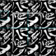 Black and white Dinosaur bones repeating pattern! Dinosaurs featured in this design include: Tyrannosaurus Rex, Allosaurus, Parasaurolophus, Triceratops, Brachiosaurus, Spinosaurus, and Velociraptor.