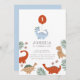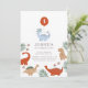 Dinosaur Boys First 1st Birthday Party Invitation présente un dinosaure bleu pastel tenant un ballon rouge avec le numéro 1 à l'intérieur du ballon dans un décor coloré et amusant sur le thème des dinosaures. Customisez-le avec l'âge, le nom et les détails du parti de votre enfant.
