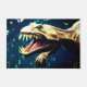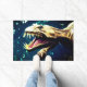 This dinosaur door mat has a scary dinosaur on it.