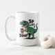 The design features a cute green T-Rex enjoying a hot cup of coffee.