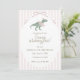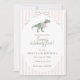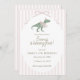 Celebrate your little girl’s fourth birthday with this elegant dinosaur invitation featuring a watercolor green dino wearing a pink bow and party hat on a soft pink striped background. Sweet and modern design perfect for dino loving girls. Customize all wording for your child’s special day.