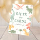 Invite your loved ones to celebrate your upcoming little miracle with our Dinosaur Gifts Cards Sign. Crafted with love, this delightful range of invitations is perfect for both baby boys and baby girls, as we've designed it to be truly gender-neutral. The dinosaurs have been hand-painted in bright, joyful hues of yellow, sage green, and blue. Paired with whimsical typography, they create a heartwarming celebration of new life about to begin. Each invitation can be personalized with your party details, adding a unique touch to your baby shower. Give your baby shower a touch of charm and whimsy with our Cute Dino Baby Shower Collection.