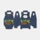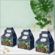 A modern, fun and eye-catching design featuring prehistoric Tyrannosaurus rex and wooly mammoth animals surrounded ancient stone rocks, flying pterodactyls, palm trees and the aurora borealis. The top lid has a scalloped banner on which a bold black template appears for your custom wording and / or names. The background is a dark navy blue filled with faux sparkling night stars. Your son will love these dinosaur themed party favours.