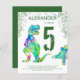 Celebrate the boy that loves dinosaurs turning 5 with this Roaring colourful T-Rex and cute stegosaurus inviting Dino fans to a 5th birthday party. Personalize this colourful psychedelic Tyrannosaurus and stegosaurus Jurassic jungle invitation by adding the name of the birthday boy or girl, the number of the birthday and the party details and you are all set for a fun packed dinosaur green themed dino birthday. All dinosaur species are welcome. Prehistoric jurassic era Dinosaur illustrations, original artwork by artist by Catherine Sweetman