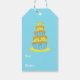 This cute gift tag features a bright orange dinosaur wearing a green striped party hat on the front. The back has an image of a colourful birthday cake. Each side has a text field that may be easily customized by you. Be sure to see the matching gift bags and gift wrap in our store. Design credit to Prettygrafikdesign.
