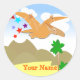 Dinosaur Pteranodon Name Stickers. A cute happy smiling orange colour dino Pteranodon in a bright pre-historic stone age landscape with palm trees, mountains and vulcano shooting stars in the blue sky with some white clouds round sticker with Your Name. Fill in your name to personalize your unique special dino sticker with your name! This dinos sticker is fully customizable, add your text(s) and image. Great back to school cartoon dinosaur stickers or birthday gifts stickers for the little and big dinosaur fan!