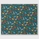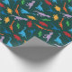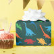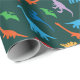 A pattern made out of seven colorful dinosaur silhouettes. There is a Tyrannosaurus Rex, a Pterodactyl, a Triceratops, a Velociraptor, a Stegosaurus, a Brontosaurus, and an Elasmosaurus.