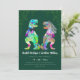 Make your wedding unforgettable with this funny dinosaur-themed wedding invitation, featuring a vibrant watercolor T-Rex bride and groom in playful pink, teal, blue, purple, green, yellow, and brown tones. Surrounded by lush eucalyptus jungle foliage and set against a rich dark emerald green background, this modern Jurassic design is perfect for couples who love dinosaurs and want a unique, whimsical twist on their wedding stationery.