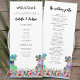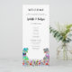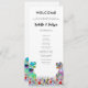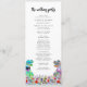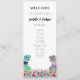 Drôle programme de jour de mariage à thème dinosaure avec mariée colorée T-Rex et marié dans une belle prairie fleur sauvage préhistorique. Facile à customiser avec les noms des mariés et mariés, la date du mariage et tous les détails de la cérémonie de mariage dans le script de typographie moderne. Fun Tyrannosaurus Rex marié et marié dino et aquarelle illustrations fleurs sauvages en bleu rose violet orange jaune rouge et vert teintes. Dinosaure original unique et oeuvre d'art florale de l'artiste Catherine Sweetman