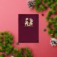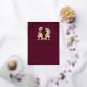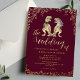 Celebrate your big day with a roar! This unique dinosaur-themed wedding invitation features a whimsical T-Rex bride and groom design, perfect for couples who love dinosaurs and want a playful twist on traditional wedding stationery. Set against a rich deep burgundy background, the invite is adorned with elegant gold foil script and gold eucalyptus foliage for a modern stylish look.