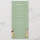 The design showcases detailed watercolor dinosaur artwork in warm brown hues on a stylish sage green background for a stylish romantic yet fresh and natural look. The layout is easy to customize with your names, wedding date, and personalized wedding menu details all presented in a stylish mix of modern script and clean typography.