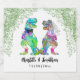 Delight your guests with these fun colourful dinosaur bride and groom dinosaur theme wedding custom wine labels. Fun colourful psychedelic Tyrannosaurus Rex dino bride and groom in pink purple blue green yellow hues and green jungle foliage with easy to personalize bride and grooms names and the wedding date in modern whimsical typography script. Unique original dino artwork by artist Catherine Sweetman
