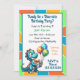 Adorable Personalized First Birthday Party invitations. Cute dinosaur theme in blue, orange and green. Cute cartoon dinosaurs holding balloons and birthday cake.