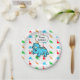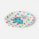 Cute hand drawn cartoon dinosaur birthday plates for a little boy's dinosaur themed birthday party. Red, green, blue and orange.