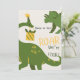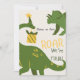 Featuring a vibrant "Stomp on Over" theme with friendly triceratops and brontosaurus illustrations, this card celebrates the unique bond of twins turning four. The front is playful and modern, while the back features a coordinating all-over dinosaur footprint print for a professional, high-end finish.