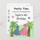 Une douce invitation au dinosaure pour les petites filles. Un dinosaure rose et vert à côté des palmiers et accentué par de petits papillons flottant autour. Customisez avec toutes les informations de votre parti selon vos besoins.