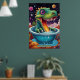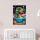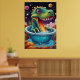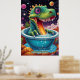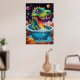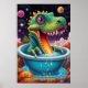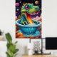 Dinosaure capricieux et vibrant qui semble être un mélange d'imaginaire et de charme préhistorique. Le dinosaure a un long cou et une grande tête, avec une expression aux yeux larges, avec des yeux surdimensionnés et captivants qui lui donnent un look mignon et curieux. Sa peau est ornée de motifs complexes ressemblant à des formes et des points colorés et tourbillonnants, comme si son corps était peint d'un kaléidoscope de textures dans les bleus, les verts, les jaunes et les violets. L'arrière - plan vibrant, avec ses cieux tourbillonnants et ses planètes abstraites, donne l'impression d'un paysage autrement mondain, suggérant que le dinosaure réside dans un monde surréaliste et fantastique. Les couleurs vives et exagérées et les traits ludiques confèrent à la créature un caractère convivial et animé, idéal pour un cadre magique ou onirique. Ce dinosaure pourrait appartenir à une espèce imaginaire d'un royaume cosmique, où la flore et la faune prospèrent dans des écosystèmes psychédéliques dynamiques, mêlant vie préhistorique et rebondissements spatiaux. Son comportement exsude l’innocence et de l’émerveillement, comme s’il explorait pour la première fois son univers fantastique.