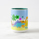Dinosaurs Are Cool Name Mug. Cute colourful cartoon dinosaurs: yellow Diplodocus, pink baby dino egg, blue Stegosaurus, orange Diplodocus, sweet yellow Triceratops and purple T-Rex dinosaurs in a pre-historic stone age landscape with palm trees, mountains and vulcano and clouds in a blue sky personal drinking mug with Your Name. Add your name to make your unqiue special dinosaurs mug! This cool dino mug is fully customizable, add your images and texts. A great happy dino gift mug with your name on it!