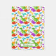 A brightly coloured Dinosaur Fleece blanket of green purple orange and red Trex,,Triceratops, Brontosaurus, Dilophosaurus, Iguanadon, Pterodon and Dino eggs all on a white background. Great for kids who love the prehistoric dinosaurs. Can be personalized by changing the name to make this an extra special blanket.