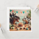 An imaginative illustration of Stegosaurus dinosaurs at a party with cake and party hats, a great card for dinosaur lovers,