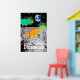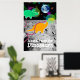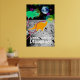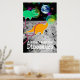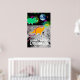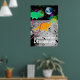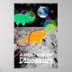 Cartoon Dinosaurs on the Moon Poster Print. Two cute little astronaut dinosaurs green Triceratops and orange Diplodocus in space on the moon with colour stars and a beautiful blue planet earth poster print with customizable text "A small step for Dinosaurs". This colourful dinosaur friends in space poster is fully customizable, add your text and images! A beautiful space travel cartoon animal gift for the big little dino fans!
